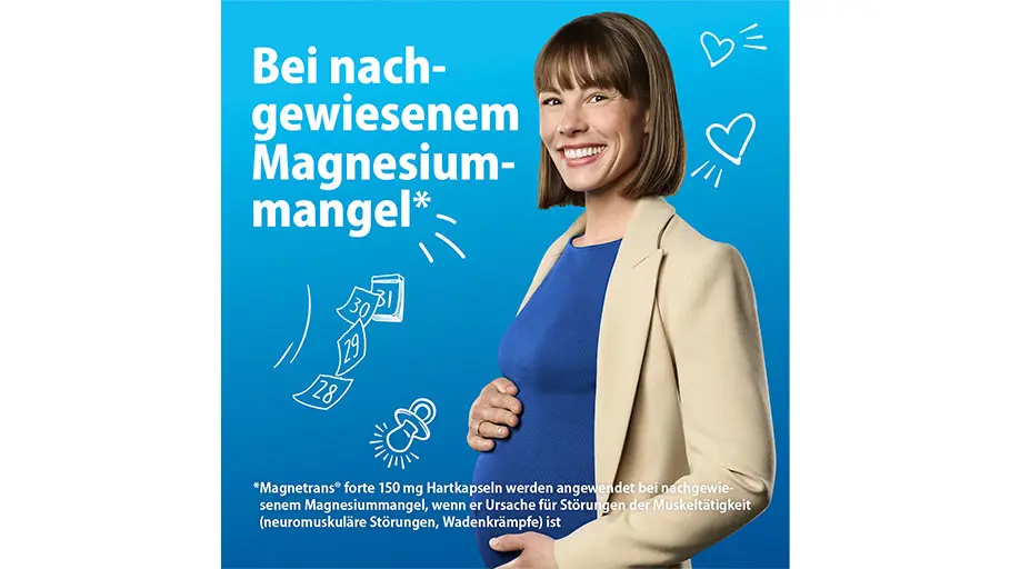 Während einer Schwangerschaft entsteht durch das Wachstum des ungeborenen Kindes und des gesteigerten Stoffwechsels der Mutter ein erhöhter Magnesium-Bedarf. Die Deutsche Gesellschaft für Ernährung (DGE) empfiehlt Schwangeren und Stillenden daher eine tägliche Menge von 300 mg Magnesium.2 Das entspricht 2 Kapseln Magnetrans® forte täglich. Im Idealfall besprechen Sie den individuellen Bedarf immer mit Ihrem behandelnden Arzt. Die Magnesium-Kapseln mit 150 mg sind leicht zu dosieren und gut verträglich.